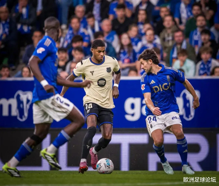 第88分钟,拉什福德开出右侧角球,阿劳霍头球破门!奥维耶多1比3巴萨!